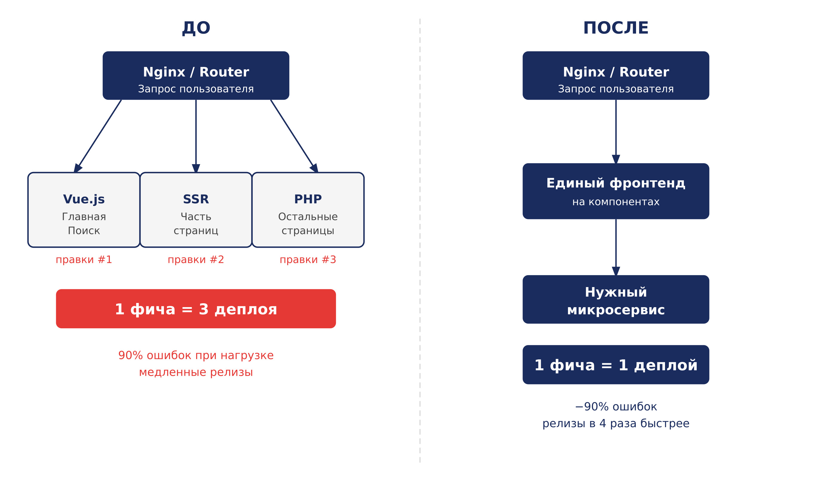 С одной стороны, можно было разработать совершенно новую версию с нуля, но это означало бы заморозку развития текущей платформы на несколько месяцев. Важные функции остались бы недоступны, что не устраивало бизнес.